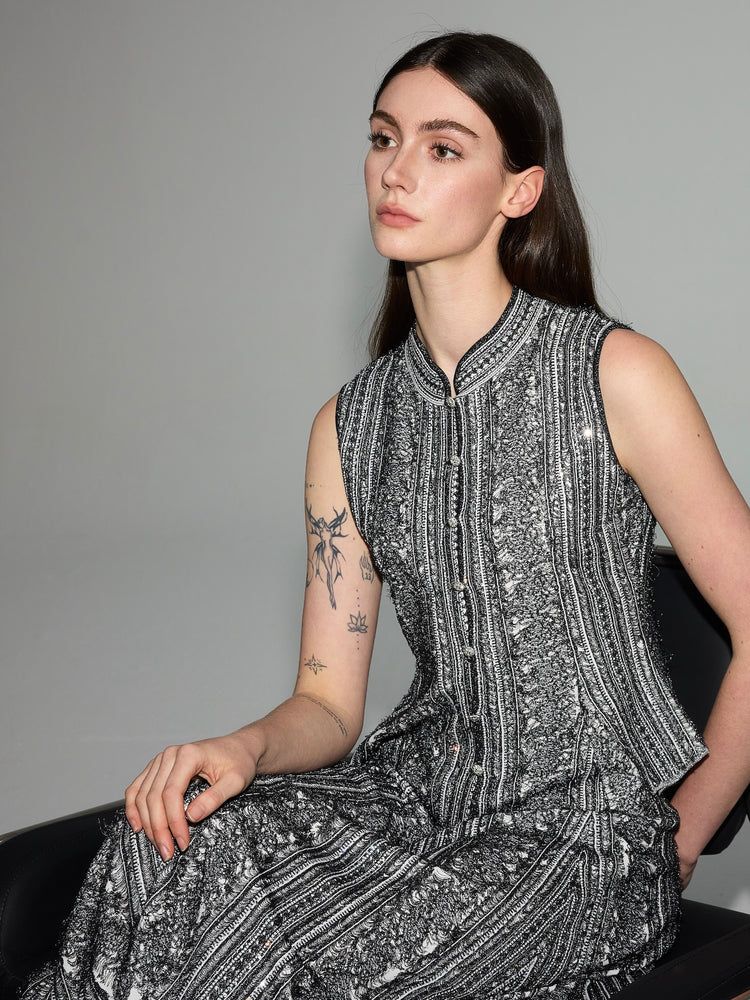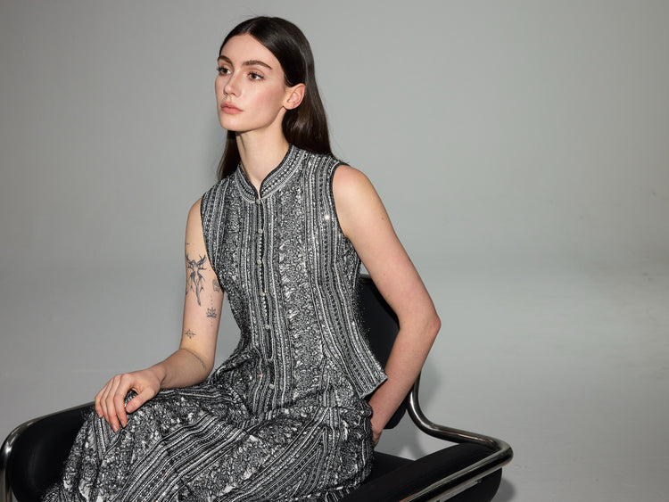 Elevate your layering game with this elegant beige vest, crafted from a luxurious silk lining. Delicately hand-embroidered for a refined touch, this vest features a feminine bow tie detail that adds charm and sophistication. Perfect for both formal occasions and stylish everyday looks. Key...