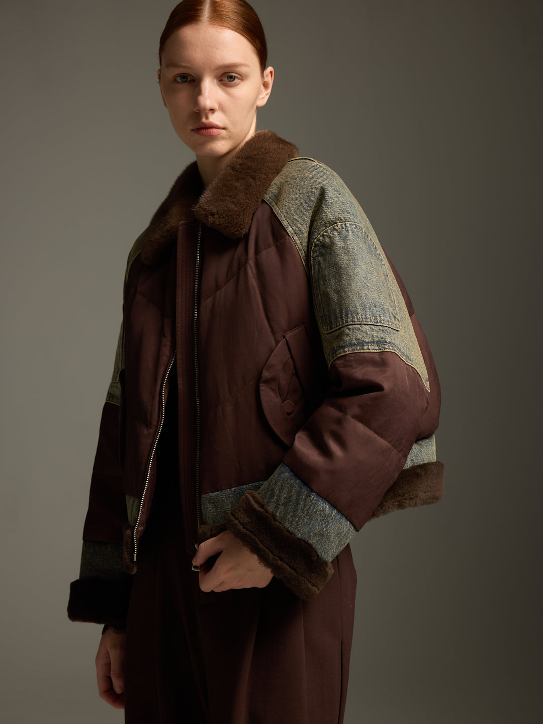 This statement down jacket is crafted with premium goose down filling, delivering exceptional warmth without sacrificing style. The luxurious mink fur collar adds a touch of refinement, while denim patchwork details on the sleeves and hem create a bold contrast with the rich espresso-toned body. Featuring a zip-front closure, quilted construction, and tailored fit, this jacket blends modern streetwear edge with timeless sophistication. Perfect for cold-weather dressing, it offers both function and fashion in one striking piece.