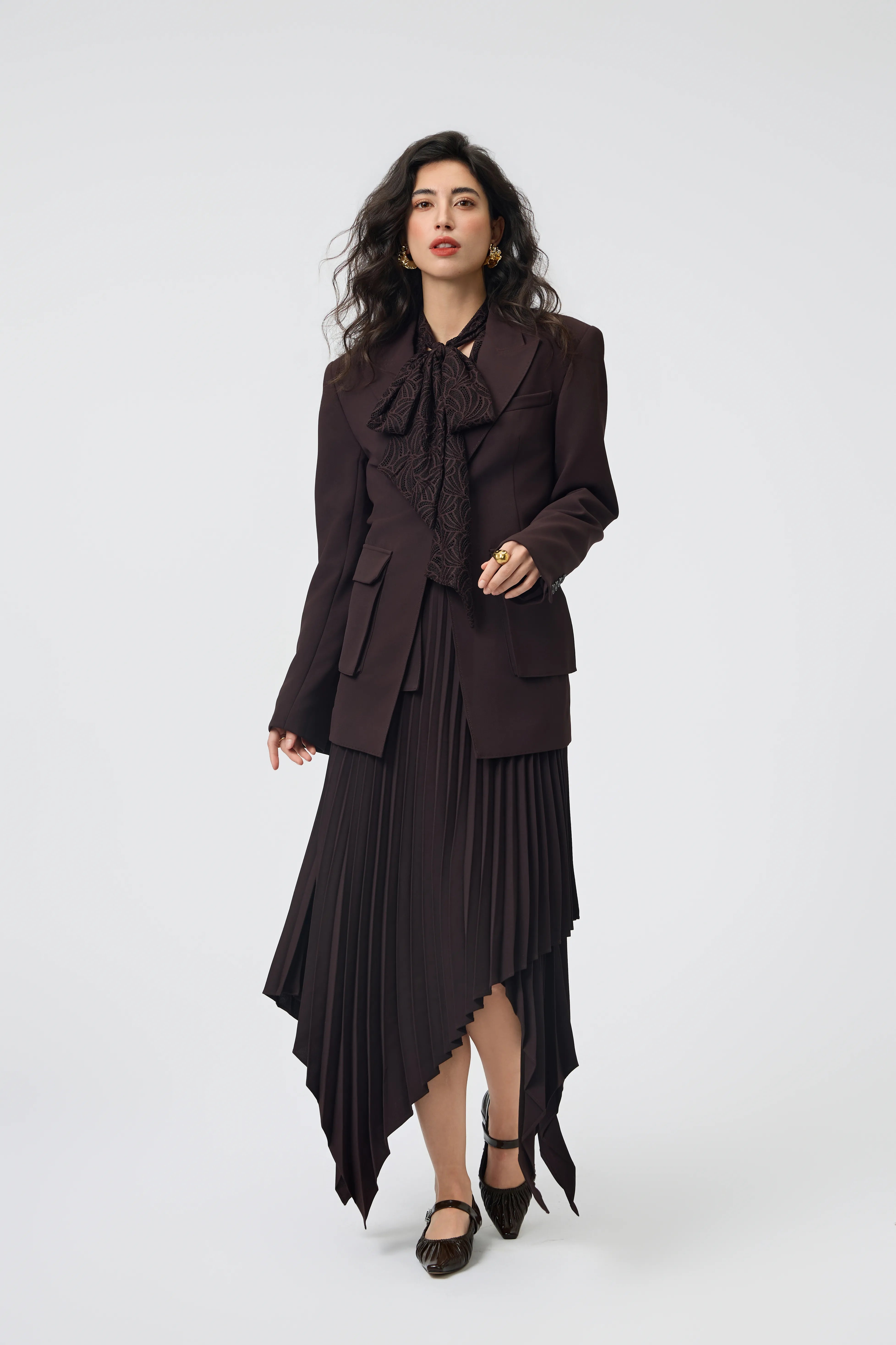 A statement of modern sophistication, the Espresso Lace Blazer blends structured tailoring with delicate feminine details.