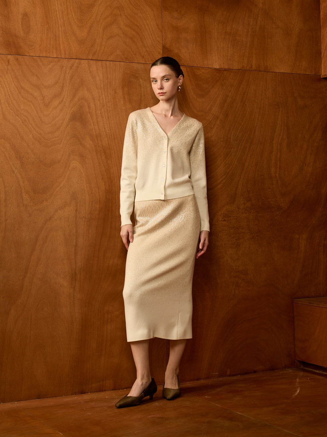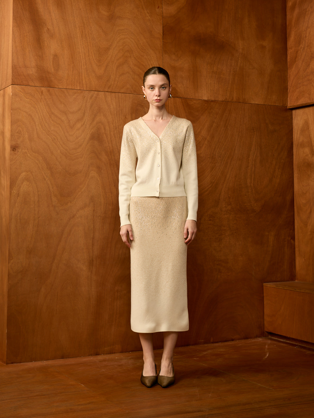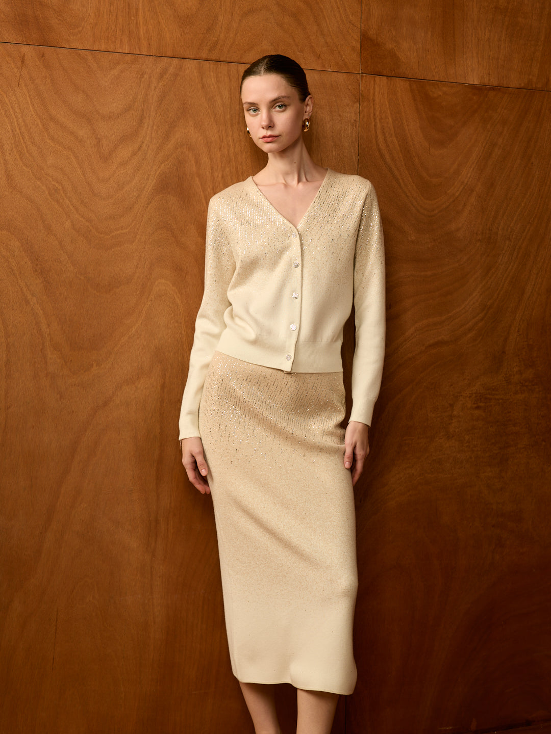 Stardust V-Neck Cardigan Set (Cardigan + Midi Skirt)