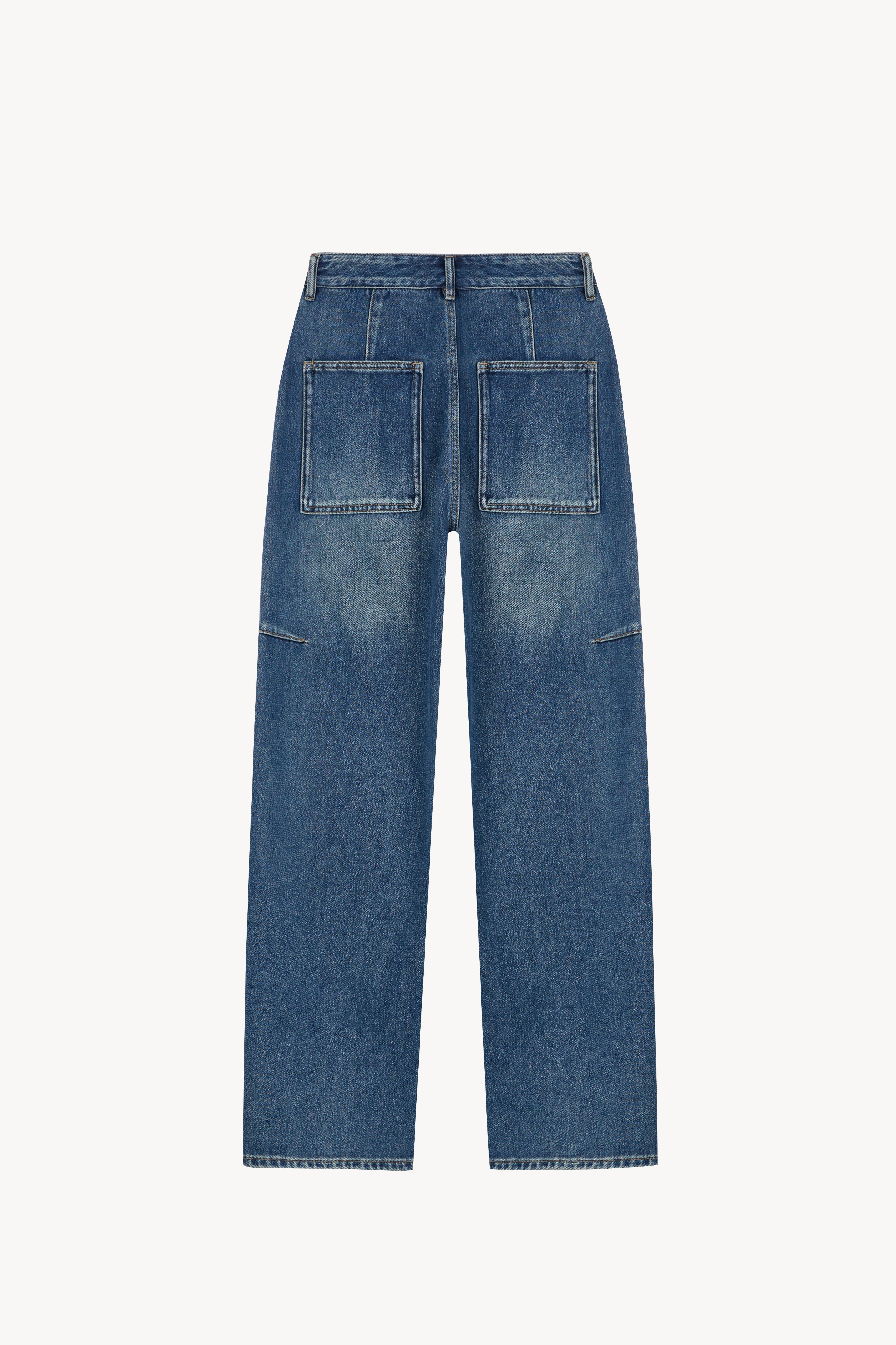 Crafted in a rich deep indigo wash, these jeans feature a distinctive curved barrel-leg silhouette that tapers gently at the ankle, creating a relaxed yet sculpted shape.